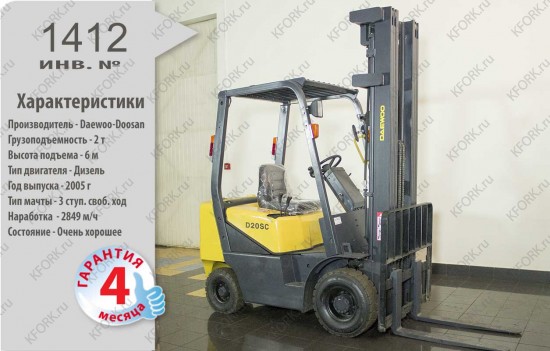 Дизельный автопогрузчик Daewoo-doosan Б/У с интентарным номером 1412 2005 года выпуска. Состояние - Хорошее. Имеет грузоподъемность 2000 кг. Гарантия: 4 мес или 500 м/час.