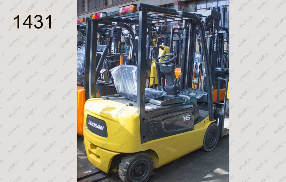 Электрический погрузчик Doosan Б/У с интентарным номером 1431 2007 года выпуска. Состояние - Хорошее. Имеет грузоподъемность 1600 кг. Гарантия: 4 мес или 500 м/час.